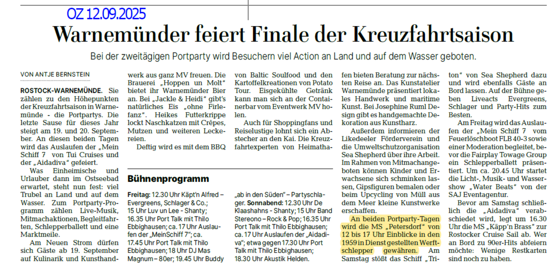 Norddeutsche Neueste Nachrichten berichtet am 27.7.2017 über die Port- Party in Warnemünde